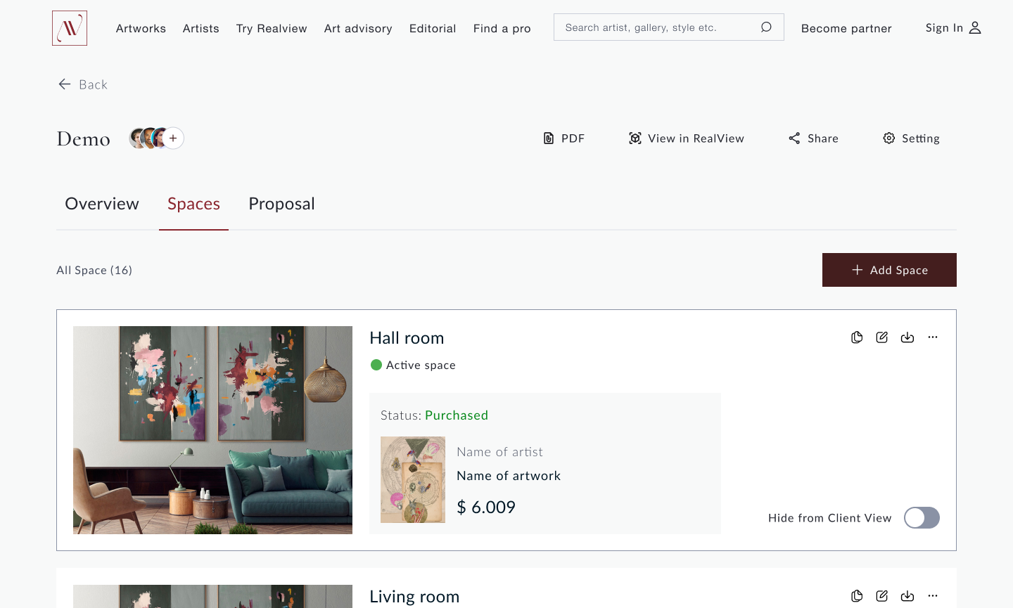 Browse our curated catalog of exceptional artworks from top artists and galleries. Select pieces, arrange them within your client’s space, and build an art story that reflects their taste and your design intent.